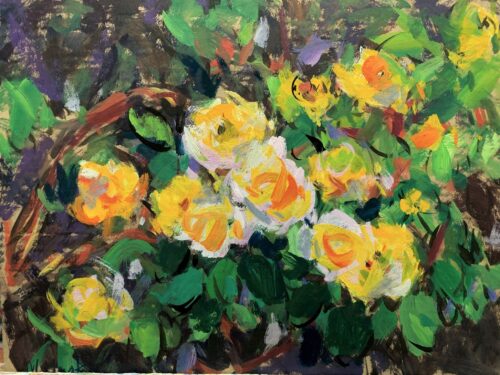 花の色は強烈なピンクなので遠くからでも目立つとても派手な色彩。花弁はカップ咲でシンプルなところも気に入っている。同じ赤のセージと組み合させて描いた。