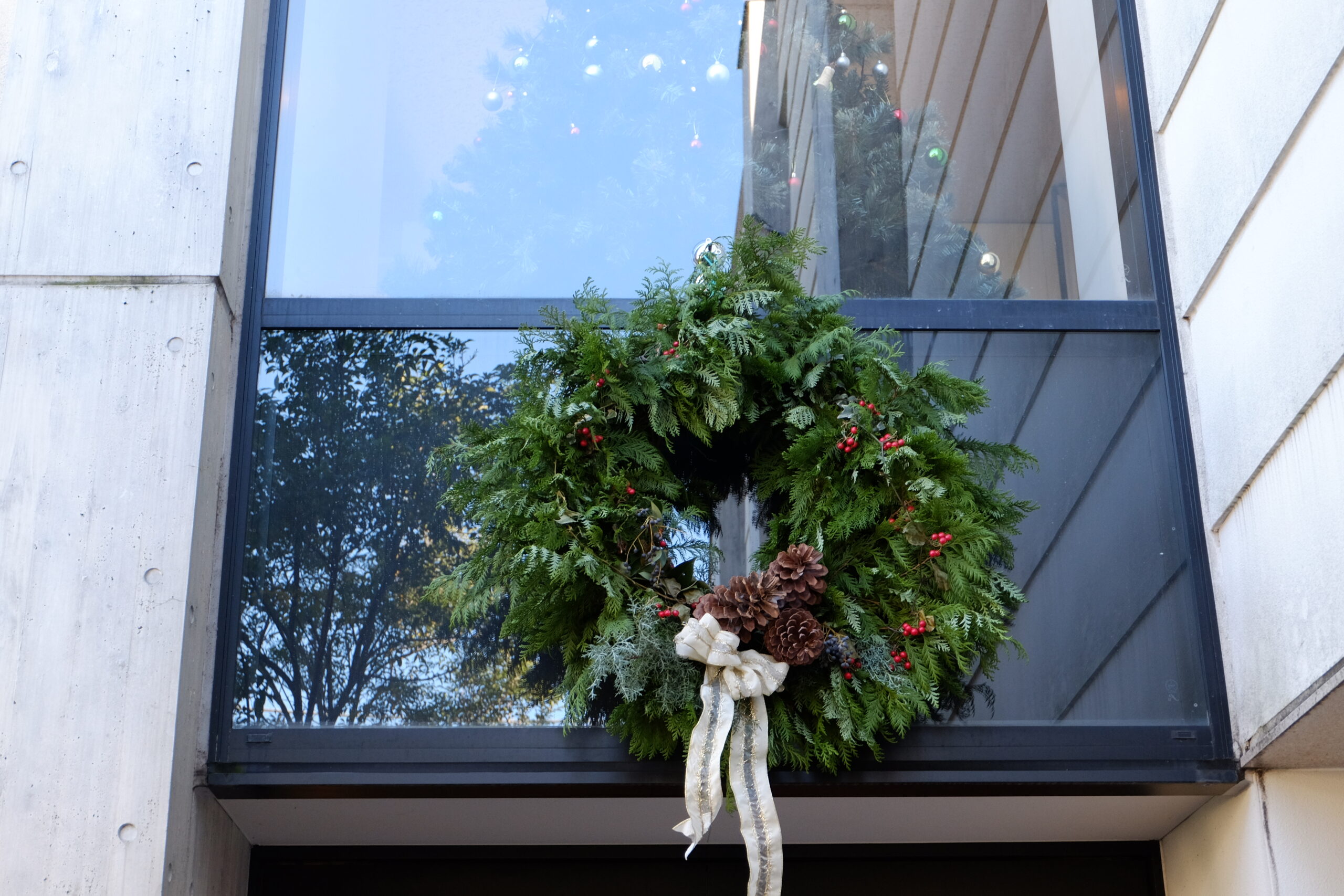 道路側のリース。飾りはリボンのみ。