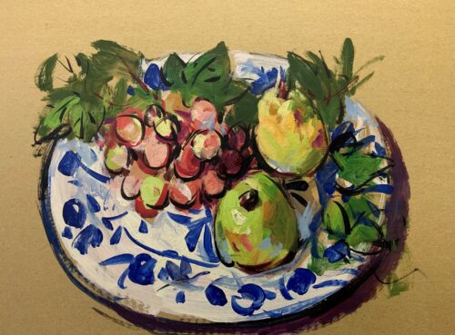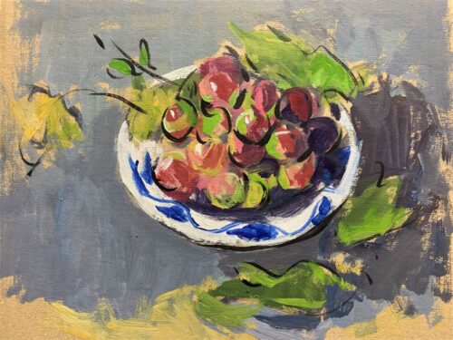 この葡萄は甲斐路で少し色の変化があるのでよく購入して描いている。葉っぱはないので、葡萄の葉っぱに似たつる性の植物を公園の雑木林から探してくる。烏瓜の葉っぱが大きさ的にはいい感じ。同じモチーフを色々な角度で連作で描くが、描きこなれてきた3枚目、4枚目くらいが良い感じになる。新型コロナが落ち着いてきたので山梨に行きたいが、まだだろうか?